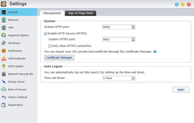 Let's dig in and check out the Settings area first, from where we can modify the system-wide settings. First we've got the General area, which takes care of the port settings/auto log-out timer but also the page style.