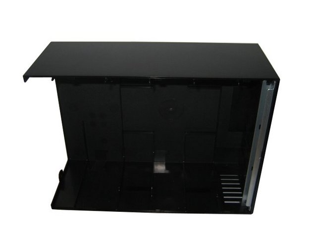 After the fast removal of the cover, we will end up with the left side of the case (the one which supports the motherboard) and a metallic frame which comprises of the drive bay section but also the back area which supports the 70mm fan and rest of the connectors.