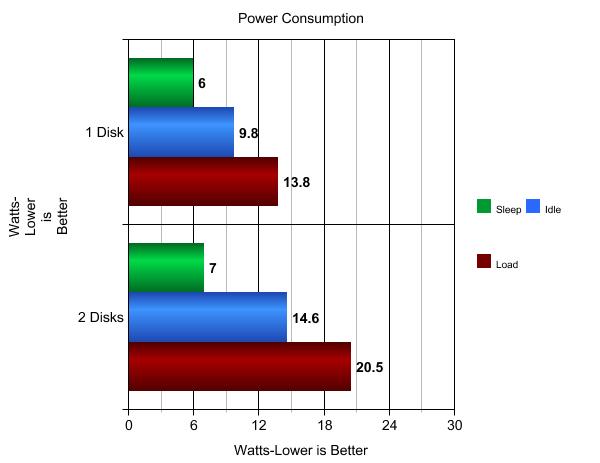 Power consumption is in keeping with previous models, consuming only 10 watts when idle and rising to around 14 watts under load(1 Disk).Even if this was left on 24/7 it wouldn't significantly impact an electricity bill over the course of a year.