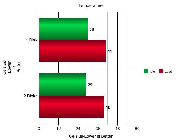 The Hard Drive temperatures tend to sit at around 29 degrees C when under general every day operation,and increase to 40c when you start copying files across.