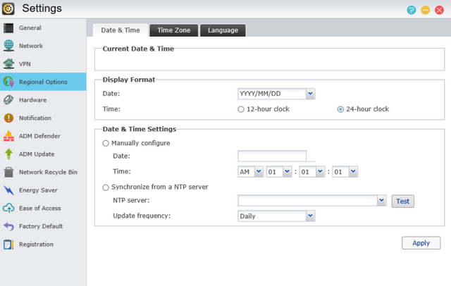 Regional options come next with Date & Time setup, Time zone and System Language.