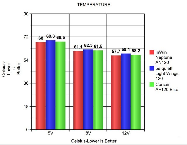 Convinced by the aesthetic performance of the Neptune AN fans, we wanted to analyze their performance. We therefore put them to the test by comparing the temperatures obtained from the all in one be quiet! Pure Loop 2 FX 360, when cooled by the InWin Neptune AN120 fans, compared to when cooled by the be quiet! Light Wings 120 instead and Corsair's AF120 Elite ones. We prefer this test methodology to common static pressure and air flow measurements, to provide data that is widely understandable and compliant with real use scenarios. Also all fans have almost the same specs.