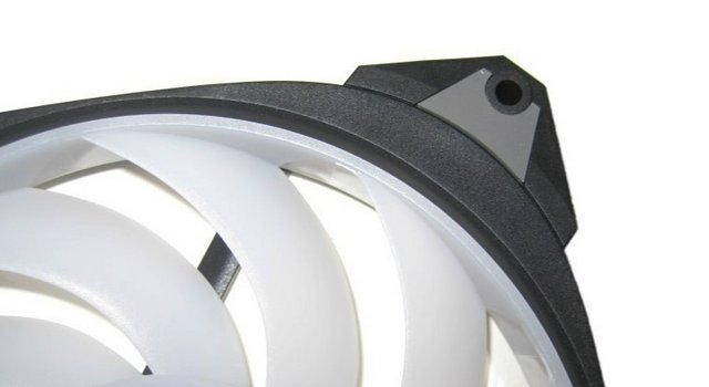 The backside of the fan has 4-arms assembly with one of the arms having a widened surface area with clip to serve as cables pass through. The fan’s power cable and LED’s power cable are routed on this arm. The frame is curved inwards although the contact surfaces maintain the straight edges that matter in not leaking air when using these as radiator fans.