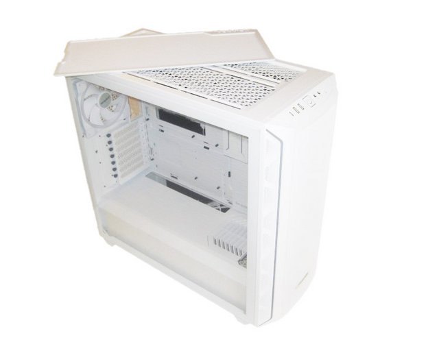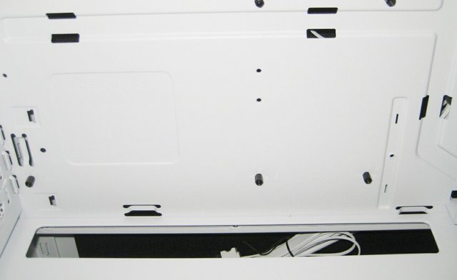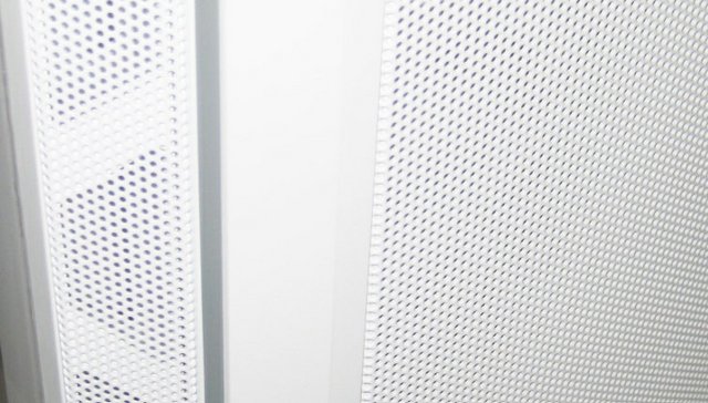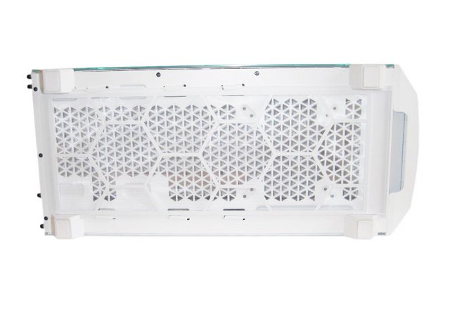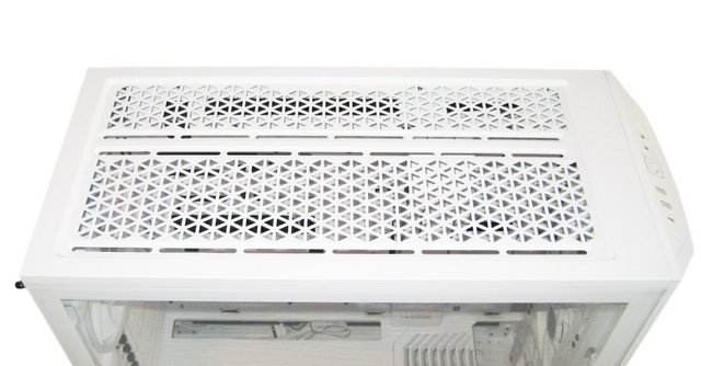Removing the filter gives us a view of the triangular-shaped holes used to ventilate the top of the Shadow Base 800 FX. We also see room for three 120mm fans to be mounted close to the glass side panel, or three 140mm fans can also be fitted. The user can install up to 420mm radiator at the top.