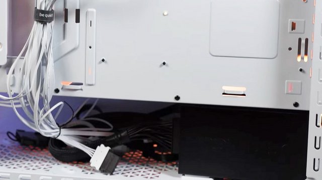 The vertically oriented panel accommodates two 2.5-inch drives. If you want to use all four 2.5-inch drive slots or both 3.5-inch drive slots, you have to remove the PWM/A-RGB hub from the cover. Decoupling rubber rings are used on the horizontal cover for drive mounting. The PWM/A-RGB hub is also simply plugged into rubber rings with pins. Alternatively, be quiet! optional accessories for mounting additional drive slots. The HDD cover from the accessories can be mounted in the bottom chamber and equipped with two optional drive cages. Each of these cages holds one 3.5-inch or two 2.5-inch drives. The rear part of the bottom chamber is reserved for the ATX power supply. It can either be screwed outside the housing to the removable power supply cover and pushed into the Shadow Base 800 FX from behind, or it can be placed on the side of the housing and screwed to the cover.