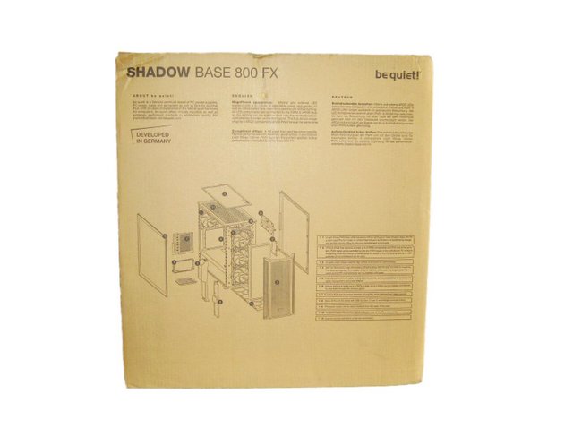 At the back we see an "about Be Quiet! marketing paragraph, and it is in several languages. Below this, we find a blown up shot of the Shadow Base 800 FX with numbered components and a legend to the right to help identify the featured parts. At the bottom, we see several more languages explaining a few critical features via the marketing blurb listed above.