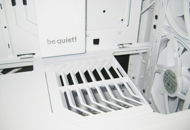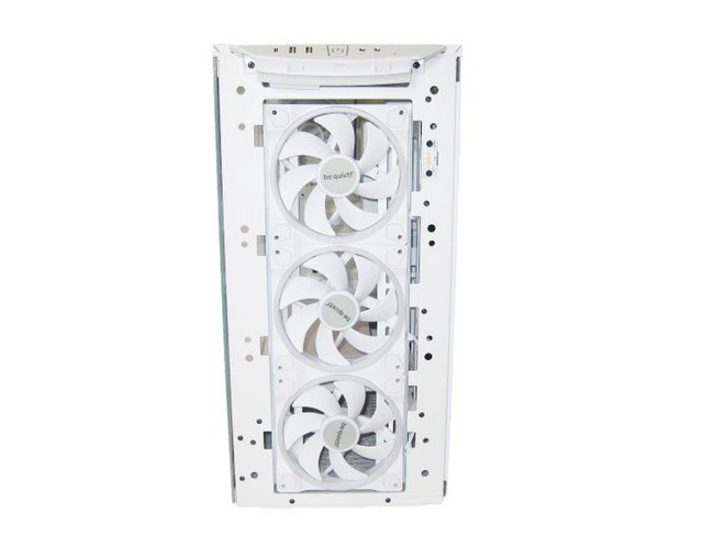 The right portion is for a pair of 2.5" drives to be installed, one above and one below the plastic plate with the be quiet! name. The plate covers the wiring, leaving just the SSD or HDD stickers in view. Towards the front, you’ll find a trilogy of Light Wings 140mm fans, which are going to deliver a huge wall of cool air to your PC build, but also provide a beautiful light show once everything is powered up. The front of the PSU shroud has a large cut-away, which allows the bottom fan to get air throughout the case, but also gives you clearance for larger front-mounted radiators.