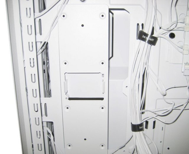 Cable management is very easy in this case. As you can see there is a lot of space for easy cable management. It is amazing how orderly all the cables look behind the motherboard tray because of the Velcro strips and numerous hooks to use zip ties on. The fact that both front and back panels can be removed gives you easy access to the PSU area for adding more cables or simply making better cable management around the bottom area. Adding an SSD to the rear of the motherboard is done by traditional means. Simply remove the mounting plate of your choice, add the drive with the included screws, and put the plate back into its place.