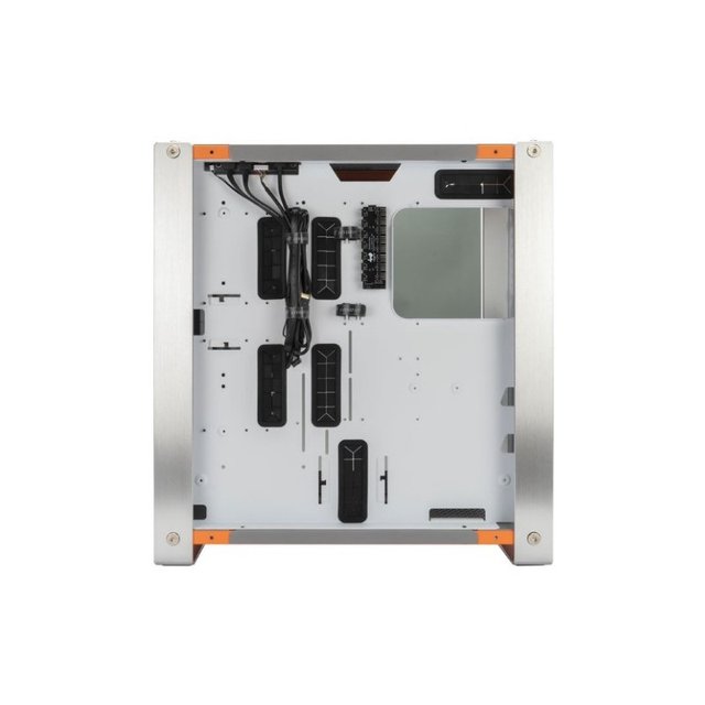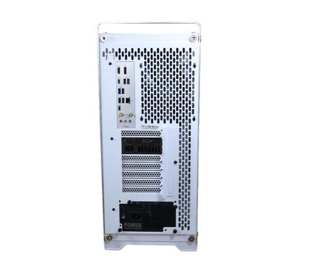 The internal space is quite large. There is no compartment cover for the power supply below. The installation base plate is white.