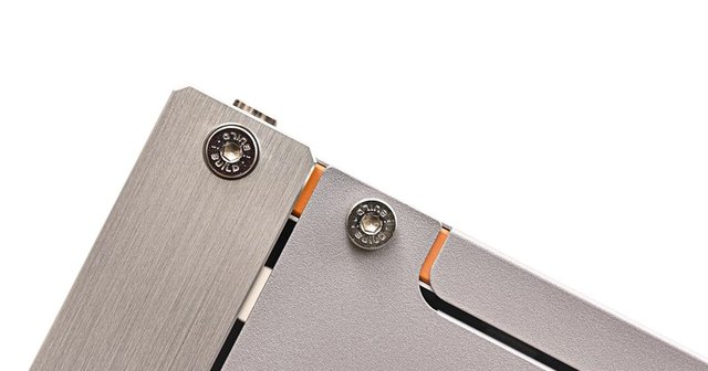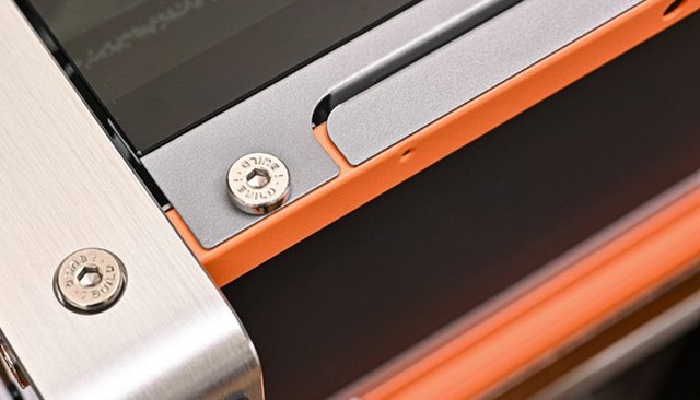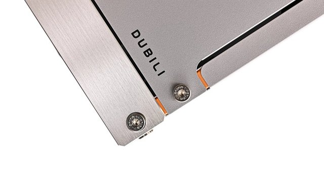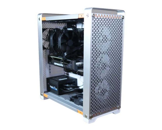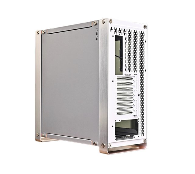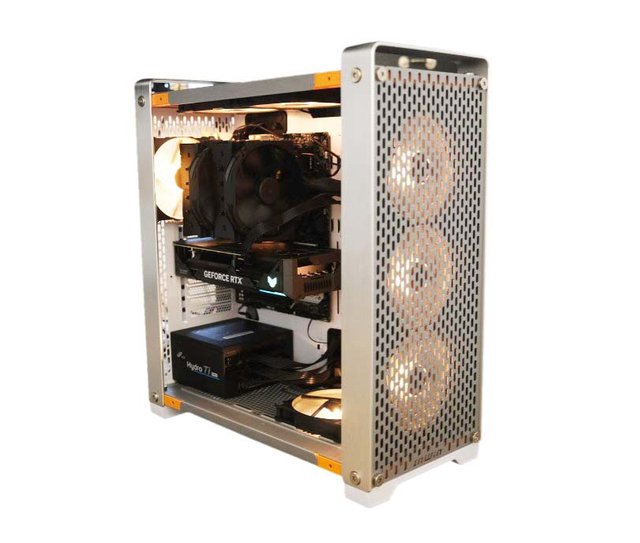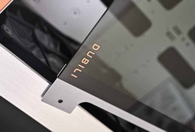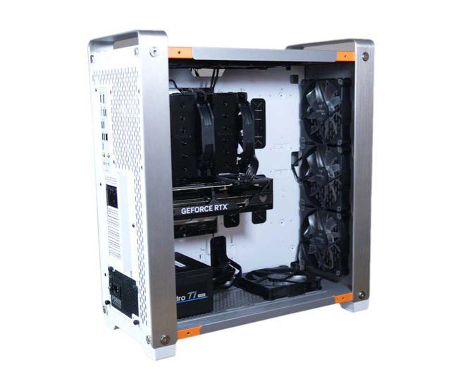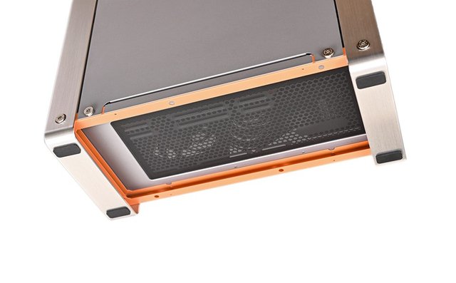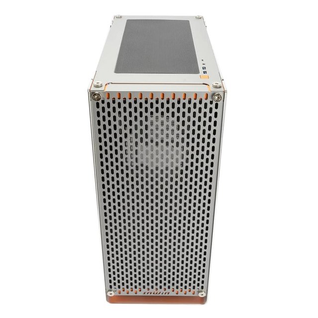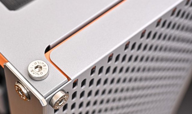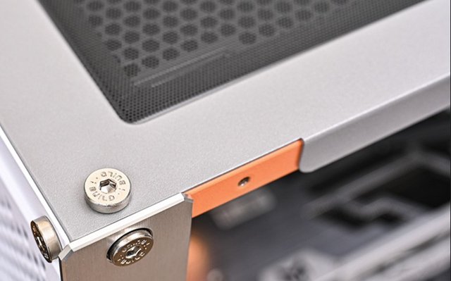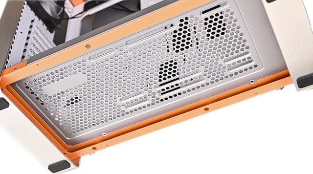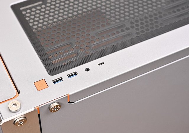 The appearance is very textured. The front and rear are covered with two U-shaped aluminum alloy brackets. The surface has a hairline treatment. The left side panel is made of tempered glass that is not too transparent. The top and bottom of the glass are fixed with metal frames. The overall appearance is titanium gray and silver, with a little orange embellishment.
