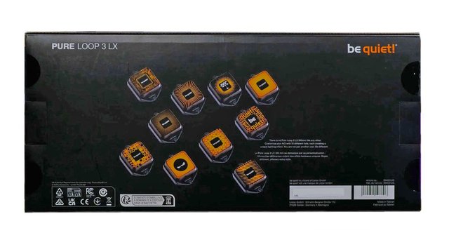 One of the sides that offers entry inside also starts with a bit of the backstory on be quiet. There is a table showing the specifications of be quiet! Pure Loop 3 LX 360 cooler. The contents of the box are also printed at the bottom. This cooler is designed in Germany. There is a QR code on the other sidethat takes you to the product page. Second, the text below the code states that the code is for the product information, and lastly, this time in gray, we see the be quiet name at the bottom.