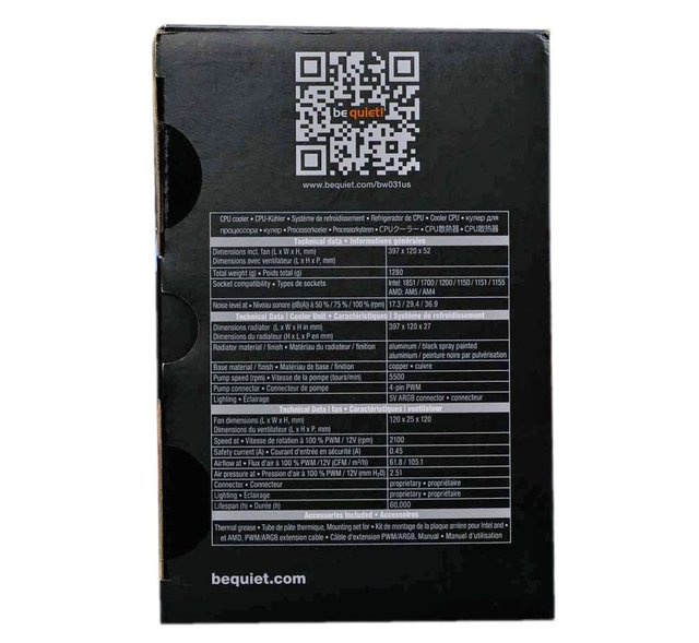As far as packaging is concerned, it is the usual design at be quiet! since we find the traditional black box. In the middle is a look at the product with the head unit illuminated, but the fans are still for added branding. Meanwhile, the top and bottom are the same with be quiet! listing the product name and radiator size on both.