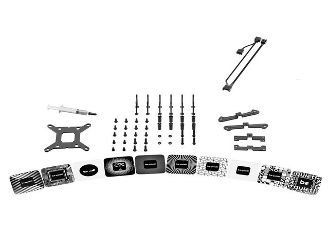 be quiet! has emphasized servicing this cooler. It comes with Three Light Wings LX 120mm PWM high-speed fans, a syringe of thermal paste, Intel and AMD mounting kits (LGA 1851/1700 and AM5/AM4 included), 10 customizable films for the ARGB pump block, Hardware and multilingual documentation.
