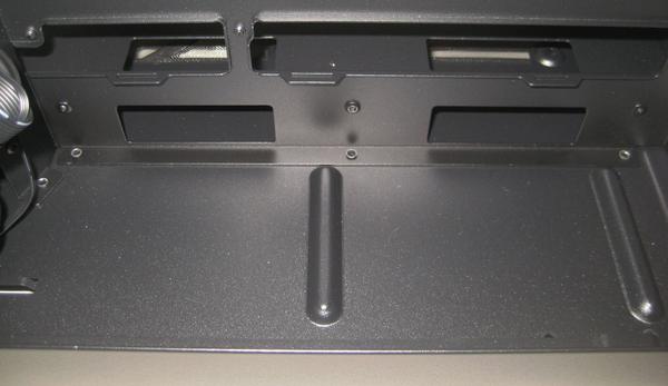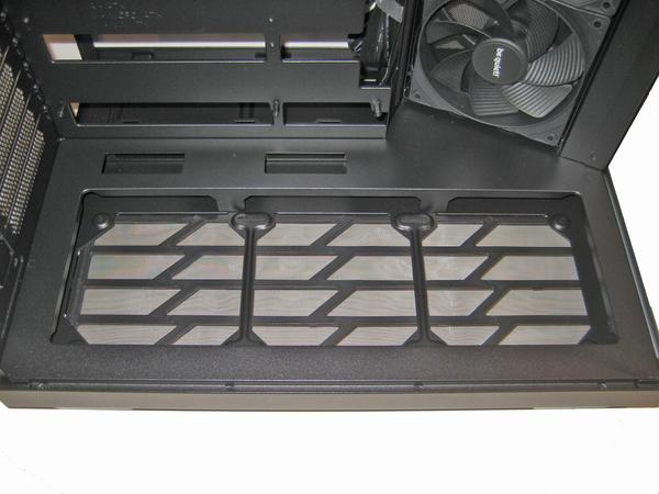 At bottom of the case is the slightly recessed air intake, which allows for flush fan mounting. Here we have another location for three 120 mm fans. However, this limiting design does not replace all three fans with an AIO radiator.