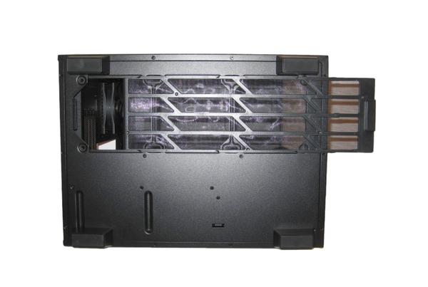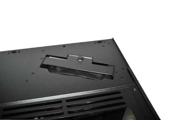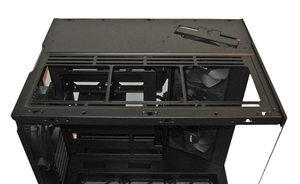 There is a slot on the top of the case that houses the cage for the three angled air intake fans. The cage is held in place by a single screw, which when removed, and of course the fan connectors unfastened, allows the cage to be removed for fan replacement or cleaning.
