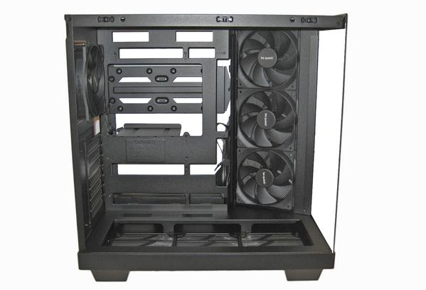 As you could already see in the picture, the front of the case is segmented into three parts. On the left is a 20-centimeter-wide tempered glass, next to which is a slot for air intake, and then a slanted metal vertical on which the front panel is located - placed somehow exactly in the middle. Through the glass front, you can practically see all the way to the back wall. However, the glass, at least in the black version, is quite tinted. This makes illuminated elements in the interior particularly noticeable. Glass elements fit together very well – perfect gap dimensions. The front glass panel is mounted similarly but secured with screws at the top. You likely won’t need to remove it when building. The standout feature here is the unique fan-mounting design.