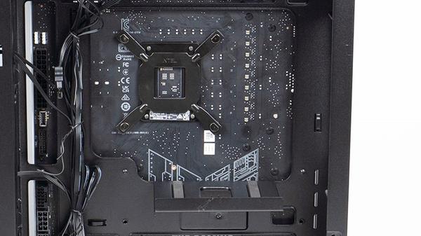 This is the main bedroom of the be quiet! Light Base 500. As you can see, there is quite a bit of space inside, which will allow for the installation of large graphics cards. We are talking about 400 mm of free space for your GPUs. We have this nice cutout for accessing the back of the CPU socket for cooling upgrades and maintenance. As for cable routing openings, there are numerous and they're located all around the motherboard tray. On the right, there are two long ones. Two other openings are located above the motherboard. Two more are also located at the bottom. It will be able to receive motherboards in ATX, Micro-ATX, Mini-ITX motherboards. be quiet! has already screwed the necessary spacers into the motherboard tray.