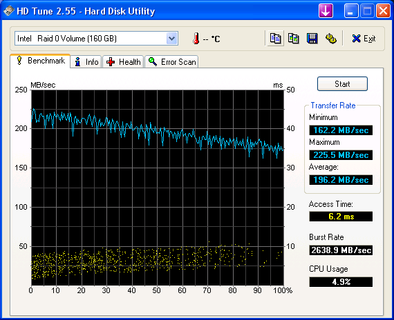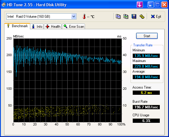 At first, I couldn't do RAID from the ICH10R so I plugged two drives in the silicon image "Speeding HDD" and it's total cheese. Only gave about 131mb/s read (sorry, I accidentally deleted the screenshot). I also took a while to find out that you can slipstream the RAID drivers (or any drivers for that matter) to make a custom XP with an application called nlite. XP does not give you the option to install RAID drivers with a USB, and there's no way to redirect the default a:\ drive to another drive during the XP installation + F6.