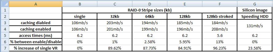 5) With cache enabled in RAID, transfer rates hovers around the same area, so it's probably smart (in terms of transfer rate) to have it on if you're not sure which stripe to pick.